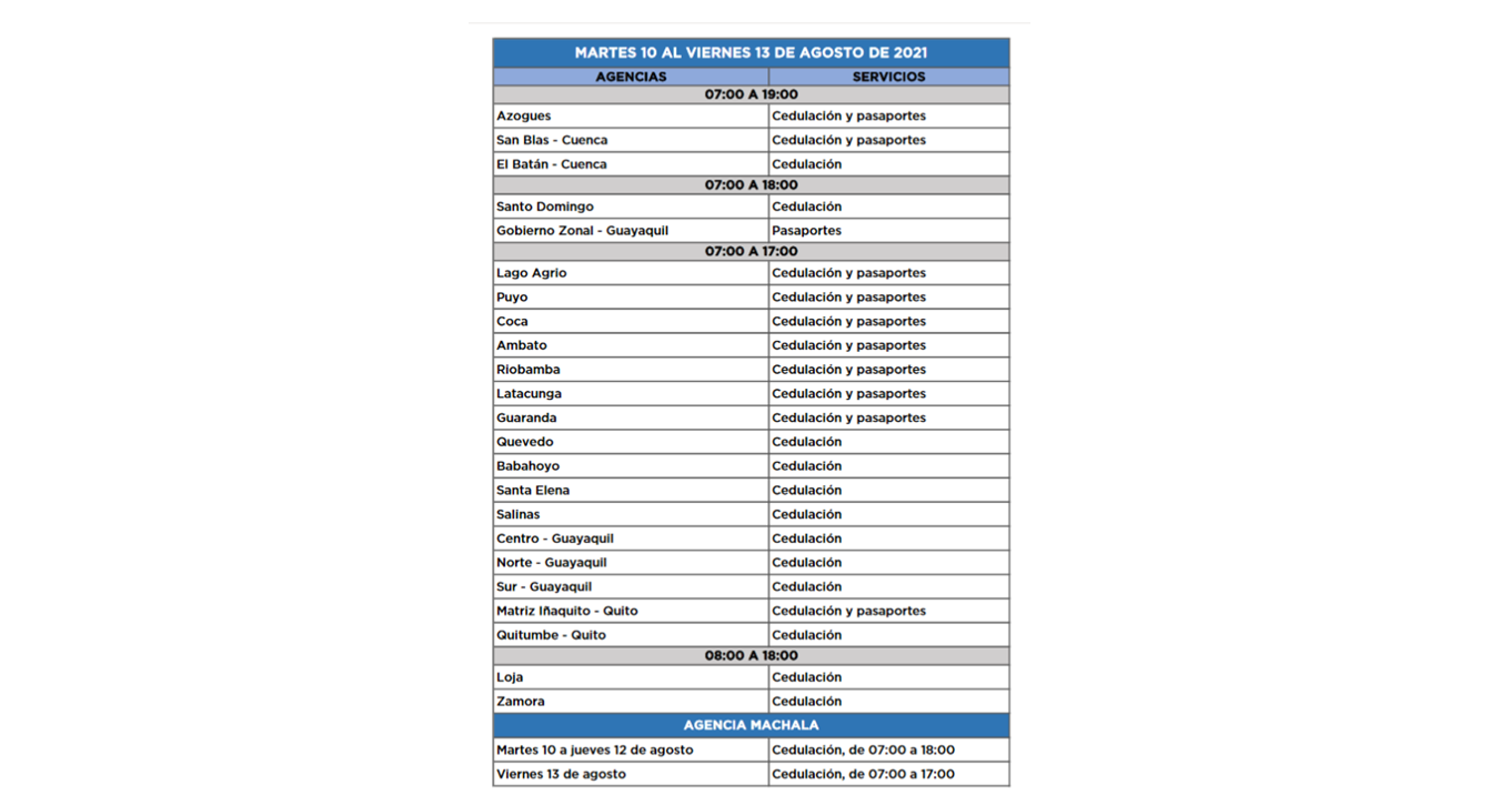 Las demás agencias del Registro Civil del Ecuador mantendrán su horario habitual de 08:00 a 17:00. Se recuerda que en la provincia de El Oro el aforo es del 25 % debido al estado de excepción vigente desde el 28 de julio del año en curso. El costo de la cédula por primera vez es de 5 dólares y por renovación es 16 dólares. El pasaporte ordinario cuesta 90 dólares primera vez y renovación; 45 dólares tercera edad; y, para las personas con discapacidad igual o mayor al 30 %, estos servicios son gratuitos.