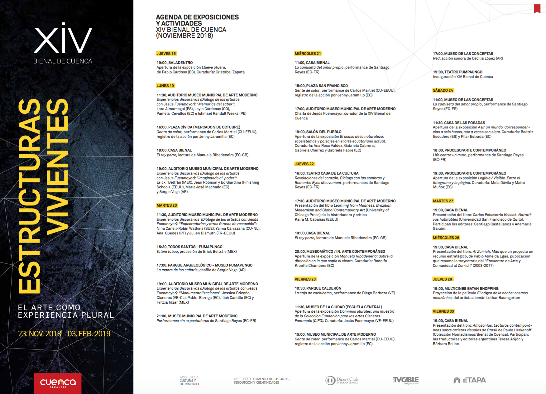 Adicionalmente, entre el 16 y el 26 de noviembre, Multicines programará una semana de publicidad con el video promocional de la Bienal en dos salas de cada complejo de Quito y Cuenca, con un promedio total de 392 cuñas.