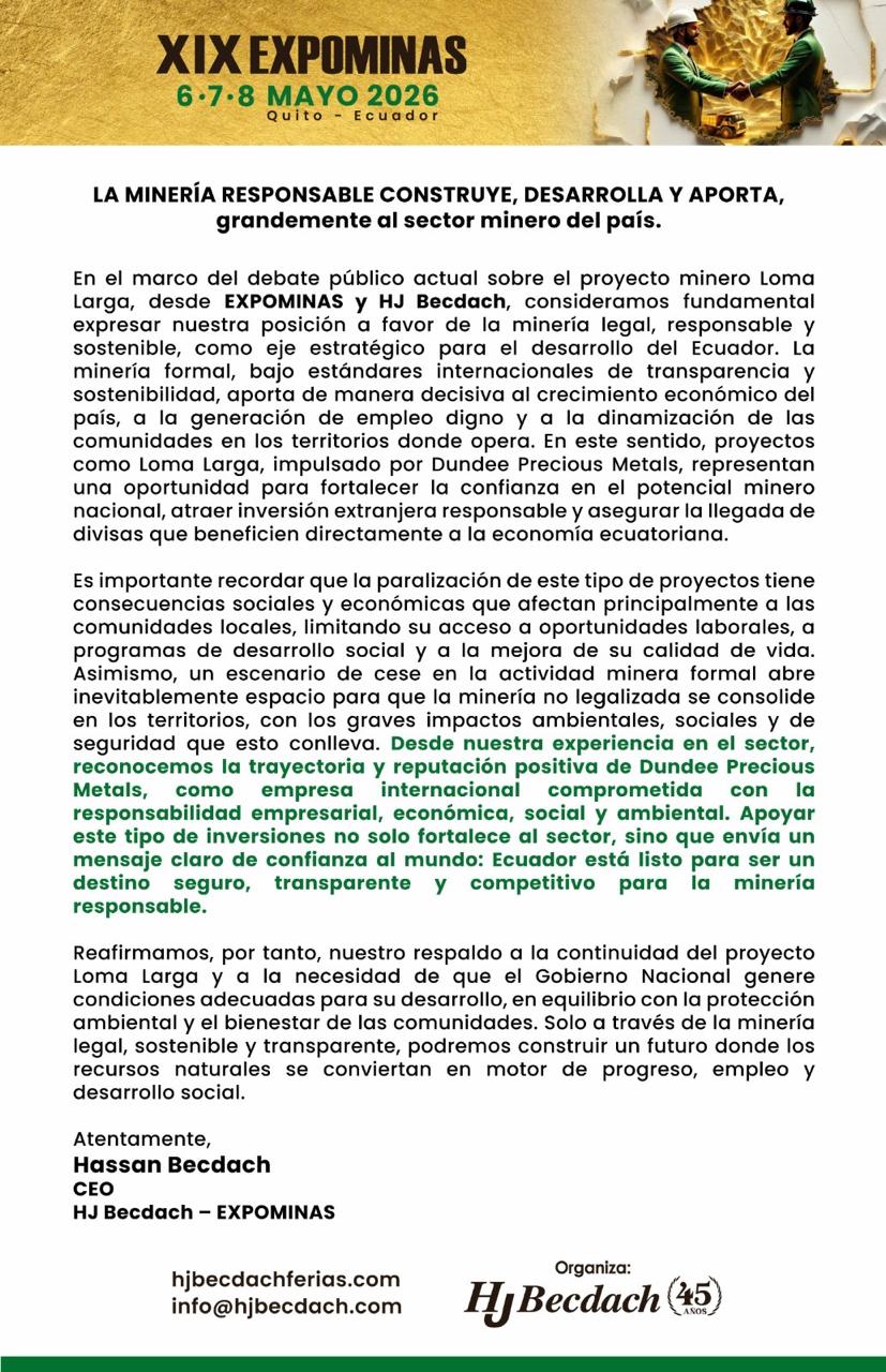 04 septiembre 2025 COMUNICADO |By Administrador Vision|0 Comment|Locales FUENTE: EXPOMINAS | Share Post Cuenca primera ciudad en el mundo distinguida como “Ciudad Embajadora de la No Violencia” Invertimos más de 800 mil dólares en el asfaltado de las calles en Girón About Post Author Administrador Vision Leave a Reply Cancel ReplyYou must be logged in to post a comment.