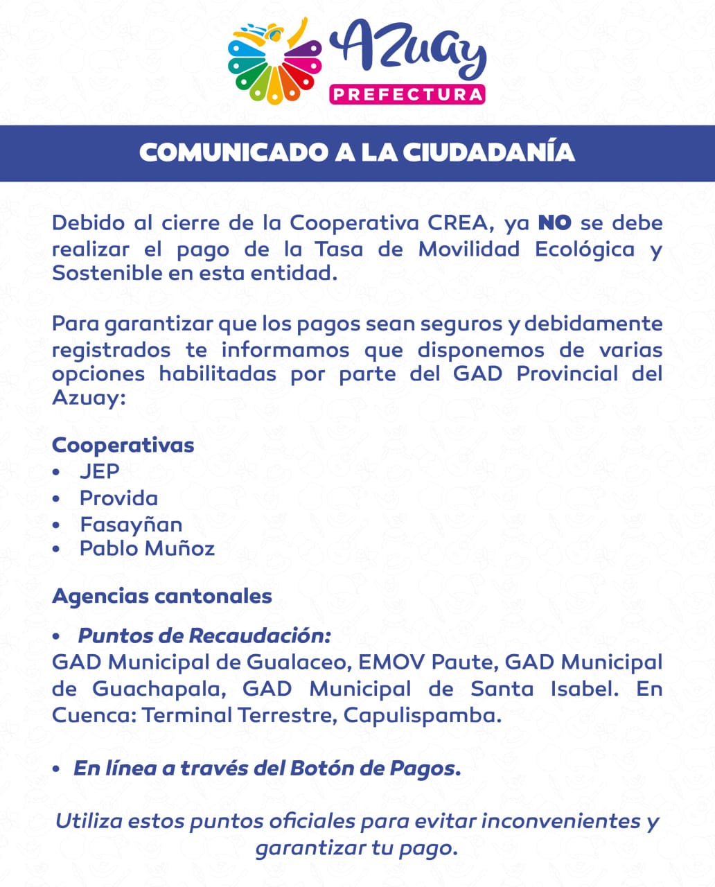 29 julio 2025 COMUNICADO A LA CIUDADANÍA – PREFECTURA DEL AZUAY |By Administrador Vision|0 Comment|Locales | Share Post La SEPS dispone la suspensión de operaciones y liquidación forzosa de la Cooperativa CREA Ltda. y garantiza la protección de los depósitos de los socios Información de trabajos en la Av. 12 de Abril About Post Author Administrador Vision Leave a Reply Cancel ReplyYou must be logged in to post a comment.