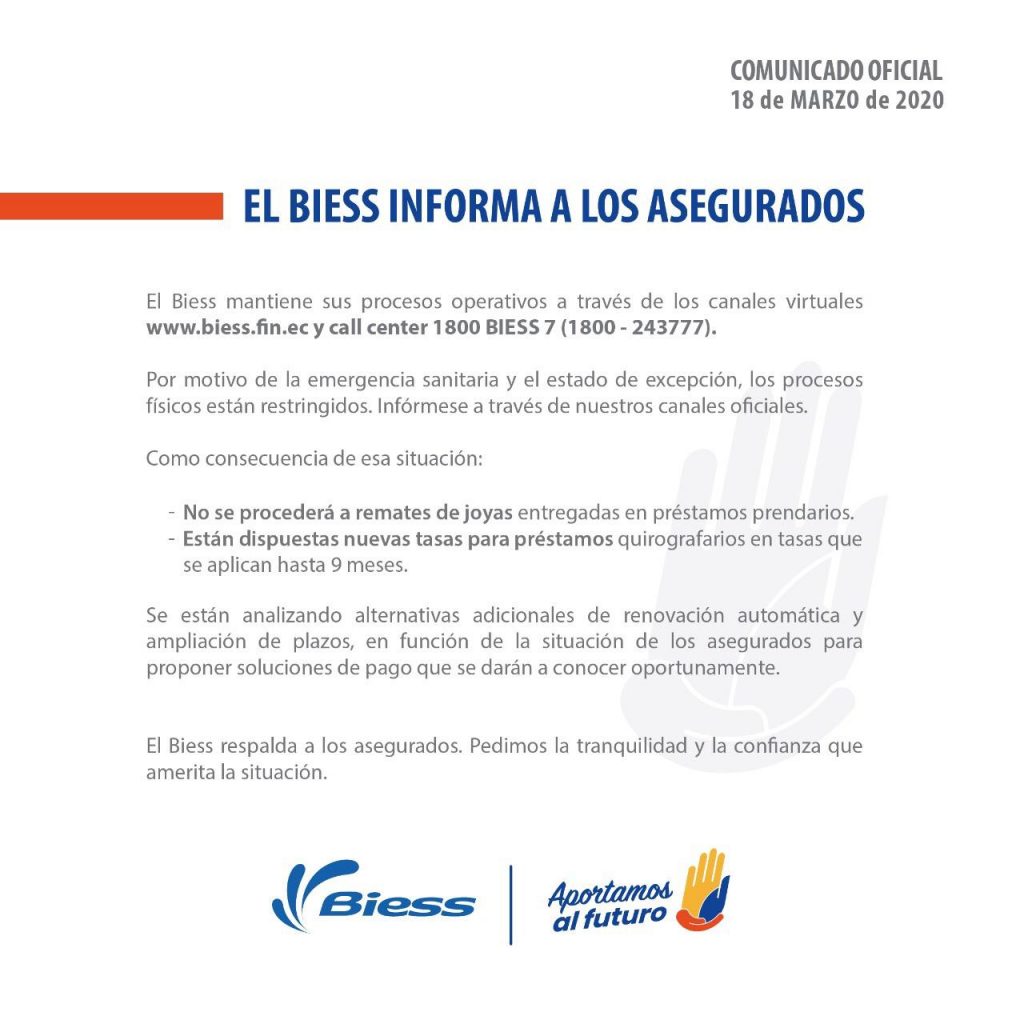 18 marzo 2020 COMUNICADO BIESS |By Administrador Vision|0 Comment|Nacionales DCS – BIESS |BIESS Share Post CON ACUERDO MINISTERIAL SE PRECISA LA APLICACIÓN DE LAS RESTRICCIONES PARA EL TRANSPORTE ANTE LA EMERGENCIA SANITARIA, EL BDE REESTRUCTURARÁ LAS DEUDAS DE LOS GAD PEQUEÑOS Y MEDIANOS About Post Author Administrador Vision Leave a Reply Cancel ReplyYou must be logged in to post a comment.