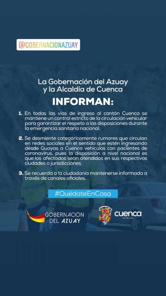 23 marzo 2020 COMUNICADO GOBERNACIÓN DEL AZUAY Y ALCALDÍA DE CUENCA |By Administrador Vision|0 Comment|Locales DCS – GOBERNACIÓN DEL AZUAY Y ALCALDÍA DE CUENCA |ALCALDIA DE CUENCA, GOBERNACIÓN DEL AZUAY Share Post INTENSO TRABAJO DE AGROKAWSAY PARA ENTREGAR PRODUCTOS A DOMICILIO PROFESIONALES DE SALUD SE CAPACITARON EN EL MANEJO Y MEDIDAS PREVENTIVAS CONTRA EL CORONAVIRUS About Post Author Administrador Vision Leave a Reply Cancel ReplyYou must be logged in to post a comment.