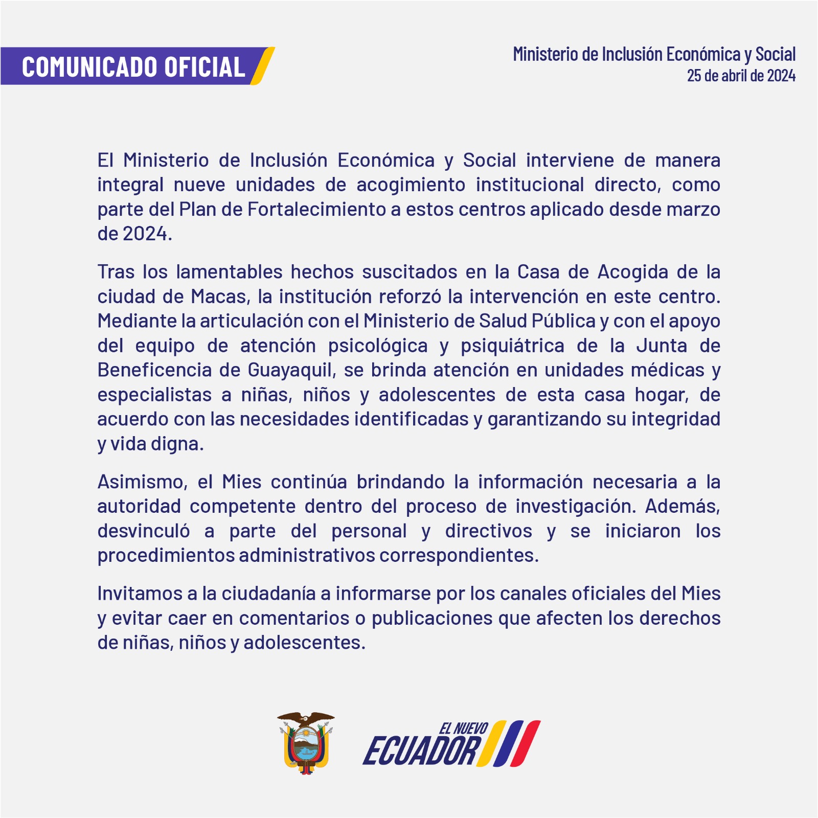 COMUNICADO MINISTERIO DE INCLUSIÓN ECONÓMICA Y SOCIAL