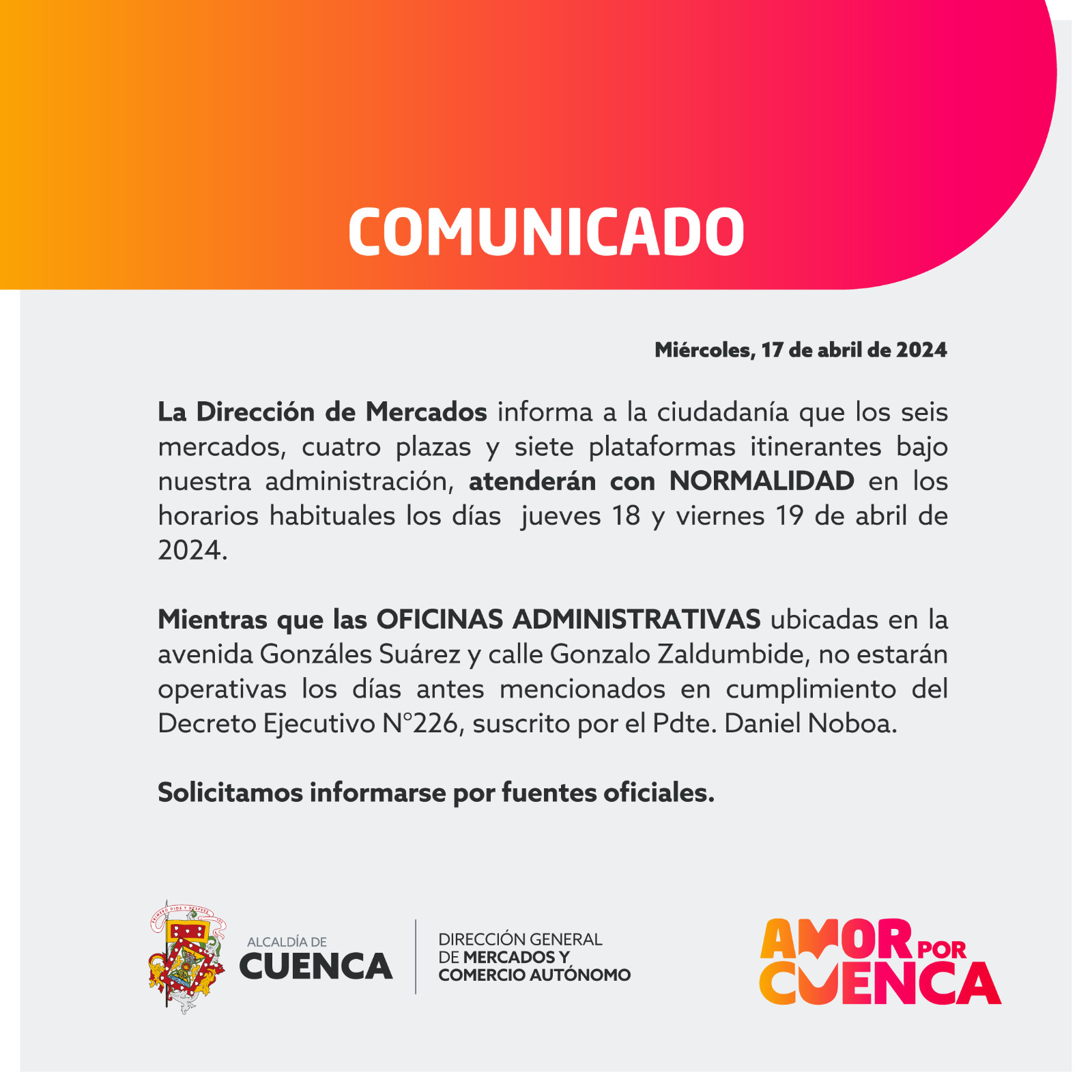 17 abril 2024 COMUNICADO OFICIAL DIRECCIÓN DE MERCADOS |By Administrador Vision|0 Comment|Locales | Share Post COMUNICADO OFICIAL ALCALDÍA DE CUENCA COMUNICADO GUARDIA CIUDADANA About Post Author Administrador Vision Leave a Reply Cancel ReplyYou must be logged in to post a comment.