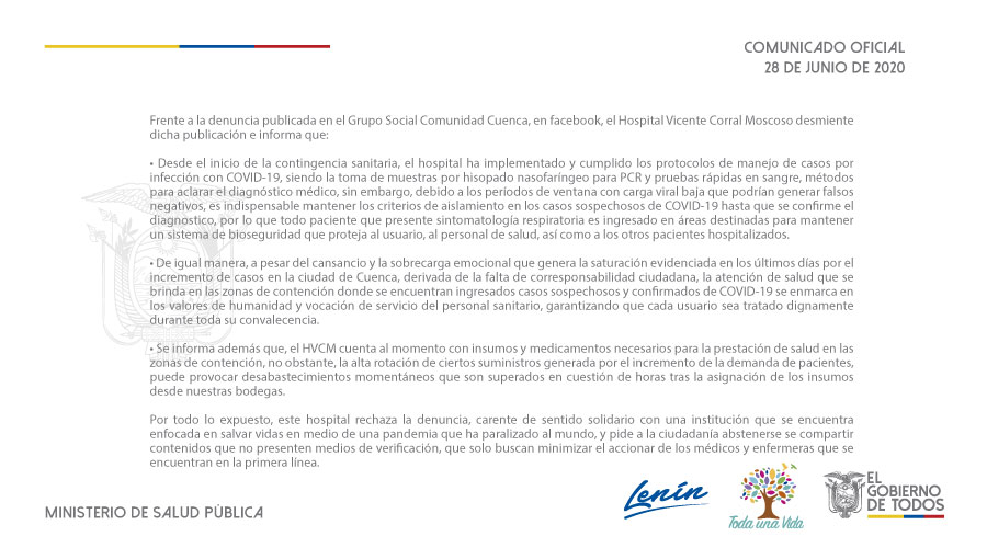 29 junio 2020 Comunicado Oficial Ministerio de Salud Pública |By Administrador Vision|0 Comment|Locales DCS – MINISTERIO DE SALUD PÚBLICA |MINISTERIO DE SALUD, MINISTERIO DE SALUD PÚBLICA DEL ECUADOR, MSP Share Post Nuevo caso de diezmos en la Asamblea ACESS, 5 AÑOS VELANDO POR LA SEGURIDAD DE USUARIOS DEL SISTEMA NACIONAL DE SALUD About Post Author Administrador Vision Leave a Reply Cancel ReplyYou must be logged in to post a comment.