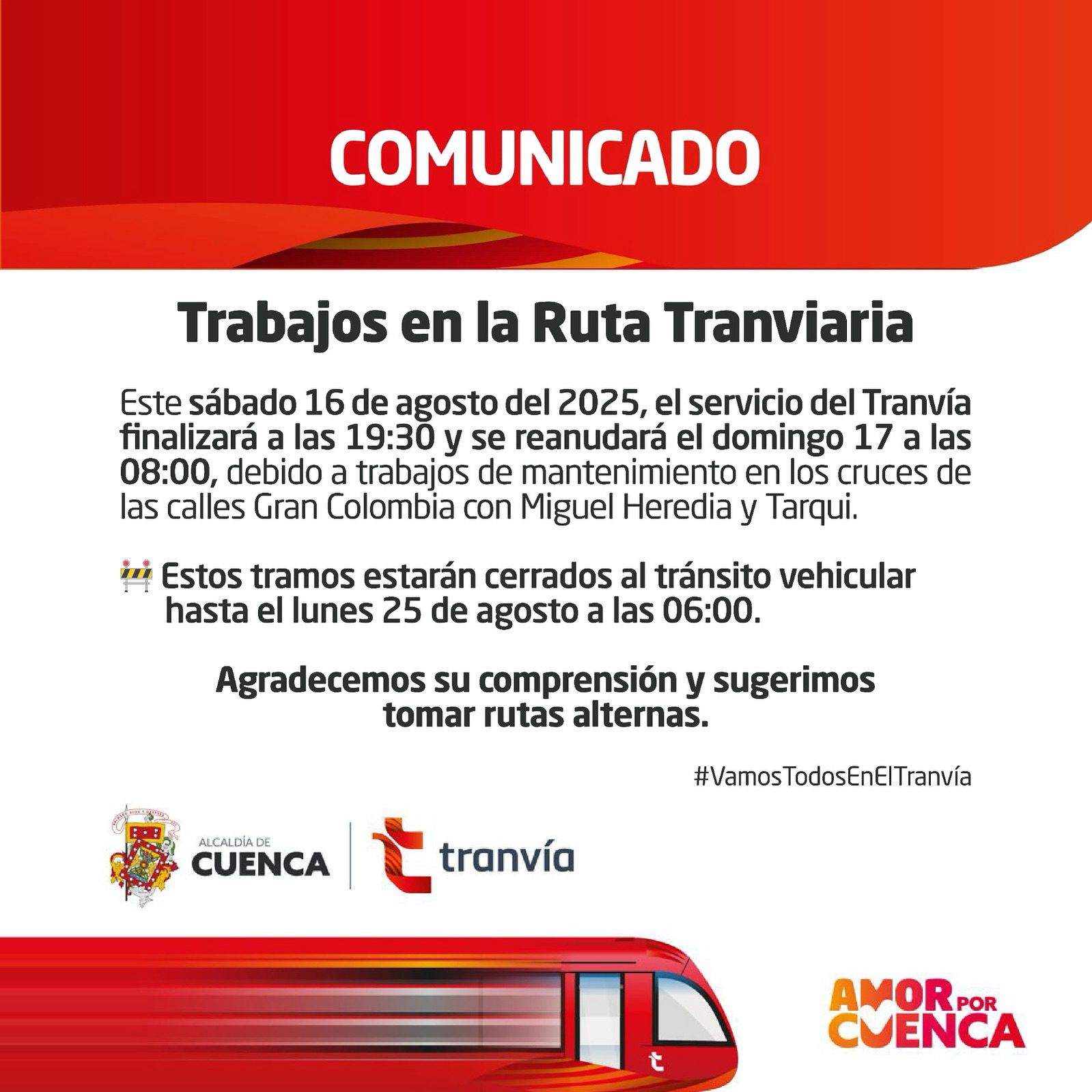15 agosto 2025 COMUNICADO TRANVÍA |By Administrador Vision|0 Comment|Locales Debido a trabajos de mantenimiento en la Ruta Tranviaria, nuestro servicio comercial este 16 de agosto finalizará a las 19:30 y se reiniciará el domingo 17 a partir de las 08:00. #VamosTodosEnElTranvía ???? #CuencaSeSiente ❤️???? | Share Post Municipio de Cuenca y el Consejo Cantonal de Salud promueve la lactancia materna para el bienestar de las familias Azuay consolida su reserva forrajera estratégica para enfrentar eventual sequía About Post Author Administrador Vision Leave a Reply Cancel ReplyYou must be logged in to post a comment.