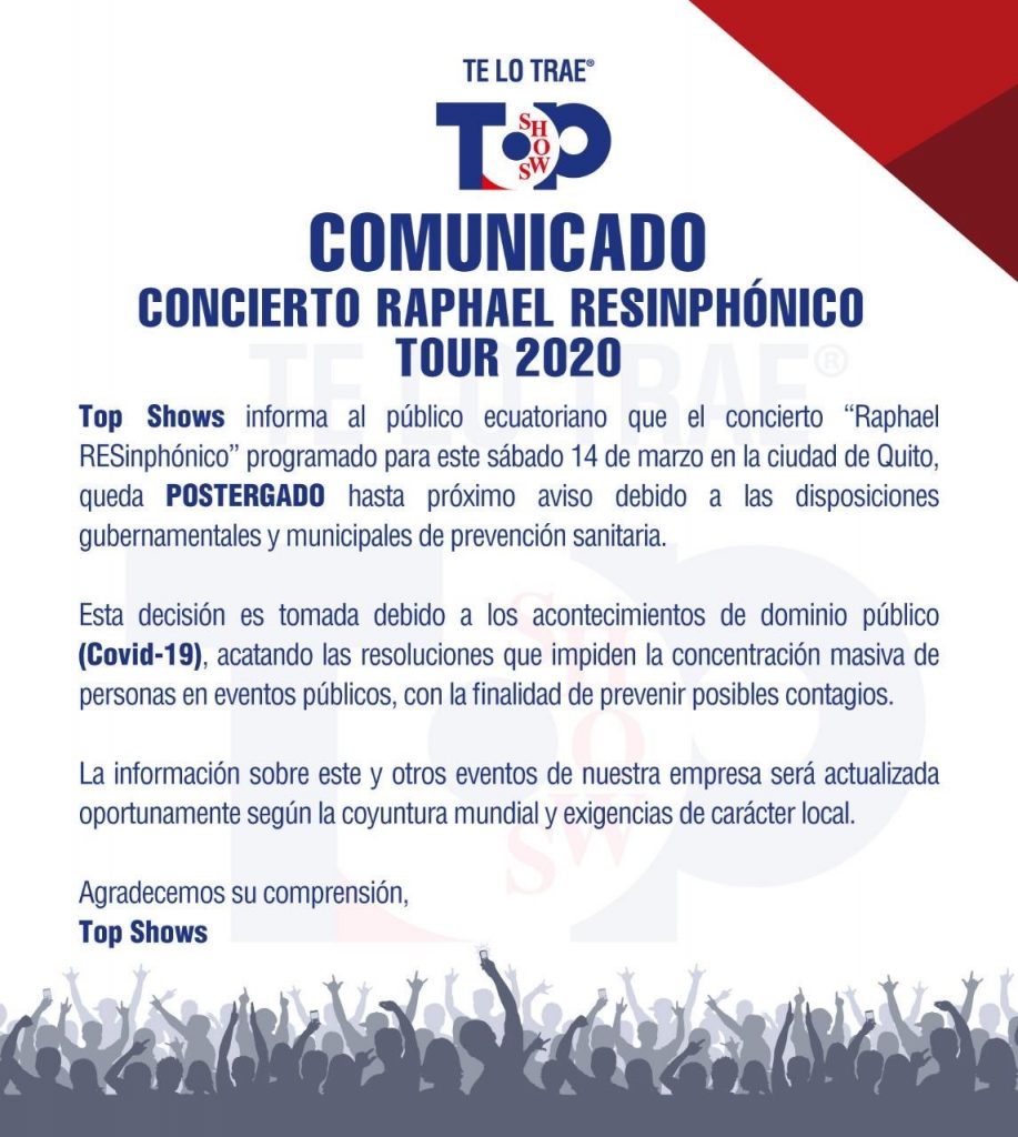 13 marzo 2020 CONCIERTO RAPHAEL RESINPHÓNICO, POSTERGA HASTA PRÓXIMO AVISO |By Administrador Vision|0 Comment|Entretenimiento DCS – TOP SHOWS |TOPSHOWS Share Post Christine, «Talento para Dos Culturas», promociona su nuevo tema «CASTAWAY» JUAN PABLO VEGA presenta ‘DEMBOW’ About Post Author Administrador Vision Leave a Reply Cancel ReplyYou must be logged in to post a comment.