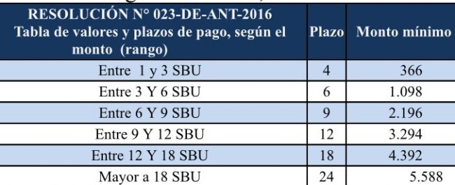 Con la finalidad de brindar facilidades a los usuarios, desde hoy, los convenios de pago de multas por contravenciones de tránsito podrán suscribirse a partir de un salario básico unificado-SBU ($366,00) y hasta 24 meses de plazo, dependiendo del monto, informó el director ejecutivo de la Agencia Nacional de Tránsito – ANT, Michel Doumet Chedraui.