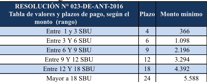 Anteriormente, los convenios de pagos por concepto de multas se efectuaban a partir de dos SBU que correspondían a USD 732,00.