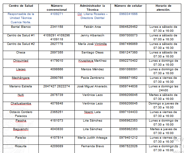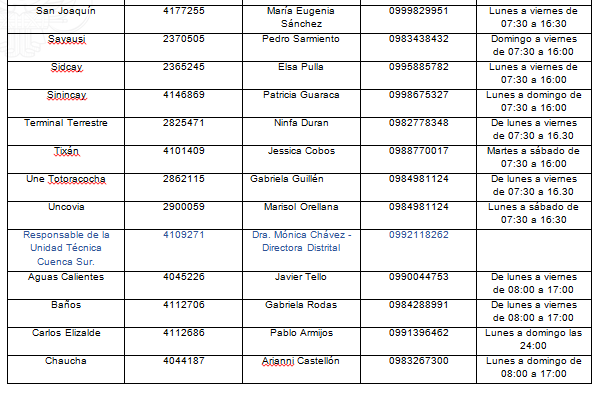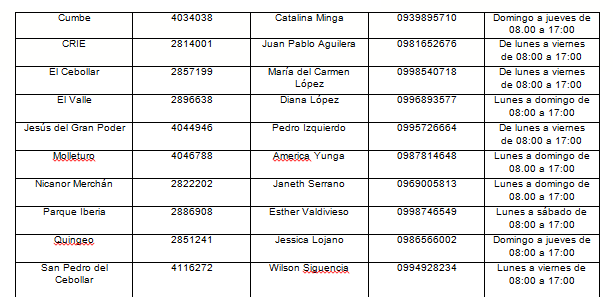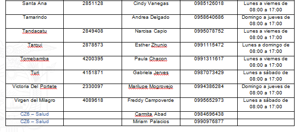 Con la finalidad de conocer y fortalecer la búsqueda activa de posibles casos sospechosos de covid-19 en el área urbana y rural, para controlar la propagación del virus, la Coordinación Zonal 6 del Ministerio de Salud Pública informa a la ciudadanía los números telefónicos de los centros de salud, administradores técnicos y los encargados del seguimiento a nivel zonal, para el reporte de los casos por parte de la colectividad de acuerdo a la ubicación de su domicilio.
