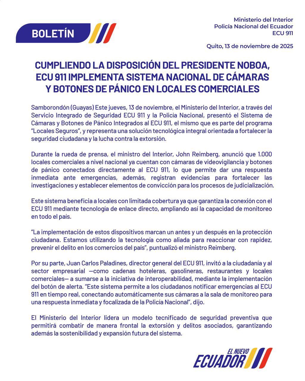 CUMPLIENDO CON LA DISPOSICIÓN DEL PRESIDENTE NOBOA, ECU 911 IMPLEMENTA SISTEMA NACIONAL DE CÁMARAS Y BOTONES DE PÁNICO EN LOCALES COMERCIALES