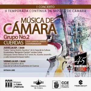 La Orquesta Sinfónica de Cuenca prosigue la temporada continua de música de cámara 2017 con dos conciertos esta semana. Será el Grupo N° 2 de Cuerdas, liderado por el Maestro José Carrión Cabrera, Contrabajista de la O.S.C. el encargado de abrir esta interesante y necesaria propuesta musical de la II Temporada 2017. Gracias a las gestiones de la Casa de la Cultura Ecuatoriana Núcleo del Azuay, y en el marco del Convenio de Cooperación Interinstitucional que mantiene con la OSC, agradecemos las gestiones del Dr. Edgar Palomeque, Presidente de la C.C.E. Núcleo del Cañar y todo su equipo de trabajo quien nos ha invitado para que el jueves 28 de septiembre brindemos un concierto en el teatro “Jaime Roldós Aguilera” de la Casa de la Cultura Ecuatoriana Benjamín Carrión, Núcleo del Cañar, ubicado en la Simón Bolívar 9-27 entre Av. Aurelio Jaramillo y Calle General Enríquez Gallo de la ciudad de Azogues a las 20:00, y el viernes 29 de septiembre en la Sala de Conciertos de la Casa de la Cultura de nuestra ciudad (Presidente Córdova y Luis Cordero, Tercer Piso a las 20:00, los dos conciertos con entrada LIBRE.