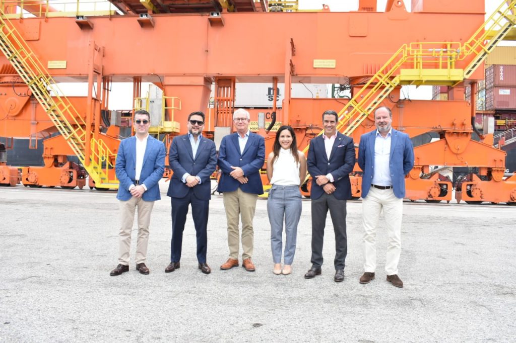 En el embarque del primer contenedor carbono neutro del mundo estuvieron presentes, de izquierda a derecha: José Antonio Contreras, Gerente General de Contecon Guayaquil S.A.; Gabriel Martínez, Ministro de Transporte y Obras Públicas; Edmundo Uribe, Presidente de TropicalFruit; Verónica Chávez, Viceministra de Promoción de Exportaciones e Inversiones del Ministerio de Producción, Comercio Exterior, Inversión y Pesca; Javier Guarderas, Gerente de Sambito S.A. Soluciones Ambientales Totales; y Christian Elte, Gerente de MSC (Mediterranean Shipping).