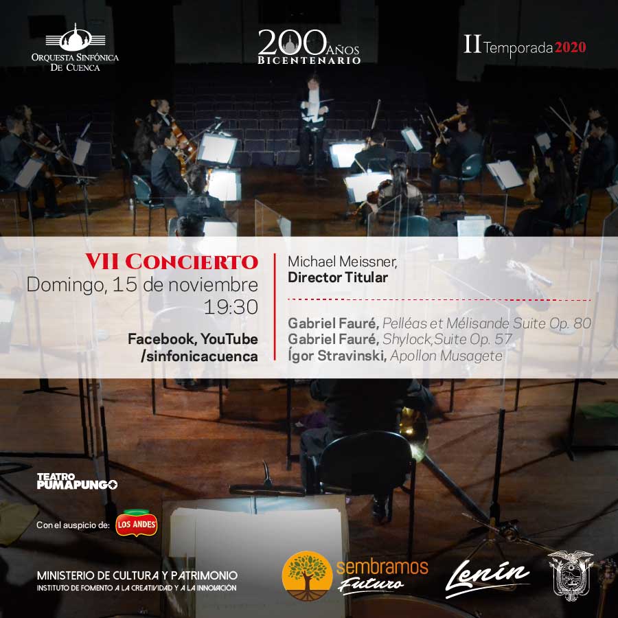 El VII Concierto de la II Temporada 2020 dirigido por el maestro Michael Meissner, Director Titular, es la próxima entrega digital. Este concierto fue grabado en vivo sin público el viernes 23 octubre en el Teatro Pumapungo siguiendo estrictamente el “Protocolo de Trabajo para la Producción de Obras Audiovisuales y Cinematográficas durante la crisis sanitaria ocasionada por el COVID-19 en Ecuador” tramitado por el Ministerio de Cultura y aprobado por el COE Nacional y será transmitido este domingo 15 de noviembre a las 19:30 en la Sala Digital de Conciertos de la Orquesta Sinfónica de Cuenca en YouTube https://www.youtube.com/user/sinfonicacuenca y en Facebook https://www.facebook.com/sinfonicacuenca.