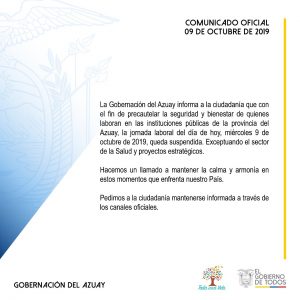 09 octubre 2019 GOBERNACION DEL AZUAY: COMUNICADO OFICIAL |By Administrador Vision|0 Comment|Locales |GOBERNACIÓN DEL AZUAY Share Post Productores de Chalaxi Alto reciben tubería para conducción de agua de riego INFORME DE VIAS: MINISTERIO DE TRANSPORTE Y OBRAS PUBLICAS About Post Author Administrador Vision Leave a Reply Cancel ReplyYou must be logged in to post a comment.