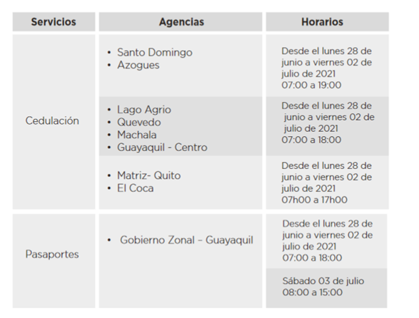 Registro Civil de Ecuador culmina el mes de junio con una nueva jornada ampliada para los servicios de cedulación y pasaportes ordinarios. Del 28 de junio al 3 de julio los horarios serán los siguientes: