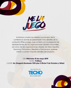 La fundación TECHO Ecuador lanza su nueva campaña titulada ​#MeLaJuego​. Se trata de una propuesta juvenil que busca decirle al país que a los y las jóvenes sí les interesa transformar el país y que sí trabajan por el derecho a la ciudad, por lo cual quieren participar libre y activamente en la vida pública. Esta iniciativa fue creada en el marco del proyecto internacional “Global Youth Advocacy”, por medio del cual 10 jóvenes del país viajaron a un intercambio en Colombia a recibir una capacitación sobre campañas de incidencia.