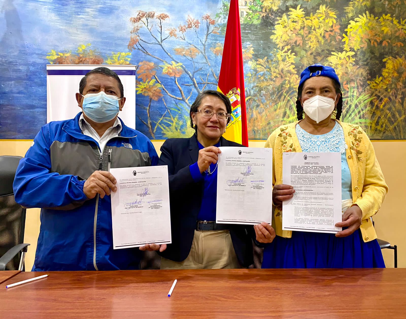 Esta mañana la prefecta del Azuay, Cecilia Méndez, suscribió importantes convenios de cooperación interinstitucional con los presidentes de las Juntas Parroquiales de Chaucha, Molleturo, Sinincay y Jima.