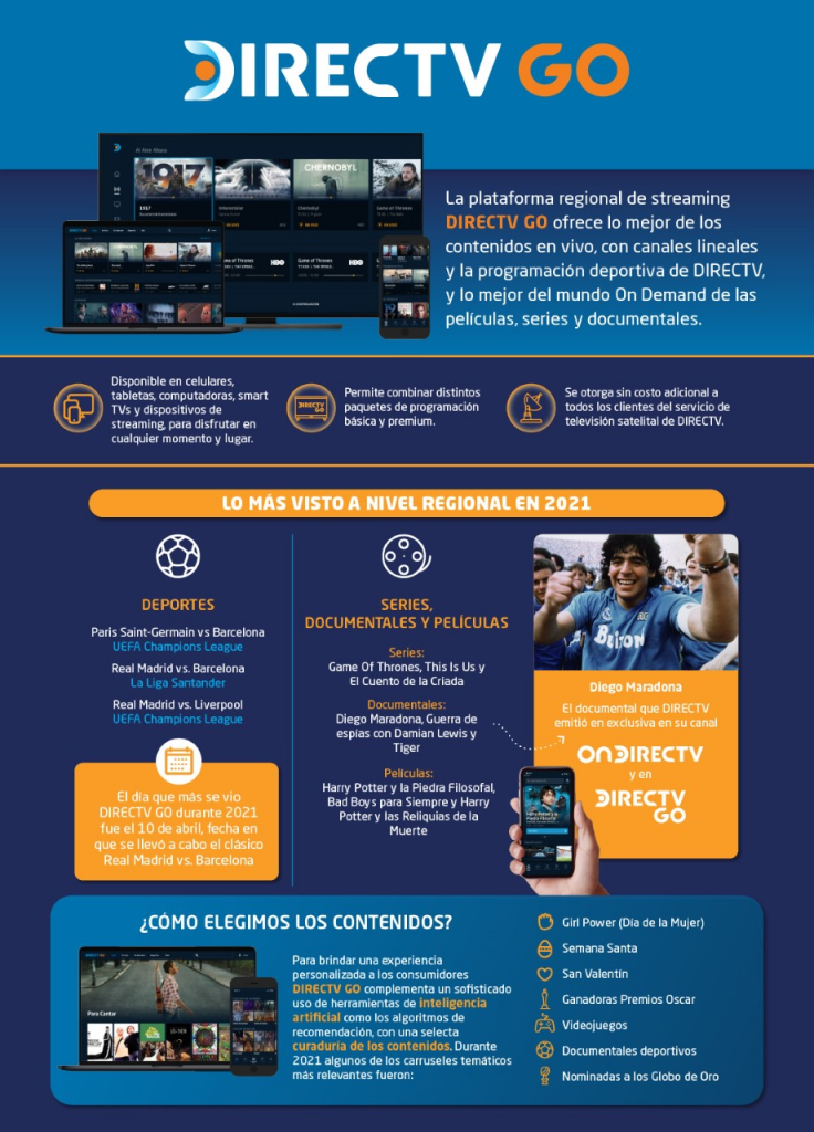 Para brindar una experiencia personalizada a los consumidores y ofrecer los contenidos más acordes a sus gustos y preferencias, DIRECTV GO complementa un sofisticado uso de herramientas de inteligencia artificial como los algoritmos de recomendación, con una selecta curaduría de los contenidos, ofreciendo en sus carruseles (listas de reproducción) los títulos más atractivos según la coyuntura local y la actualidad mundial. Durante 2021 algunos de los carruseles más relevantes fueron: