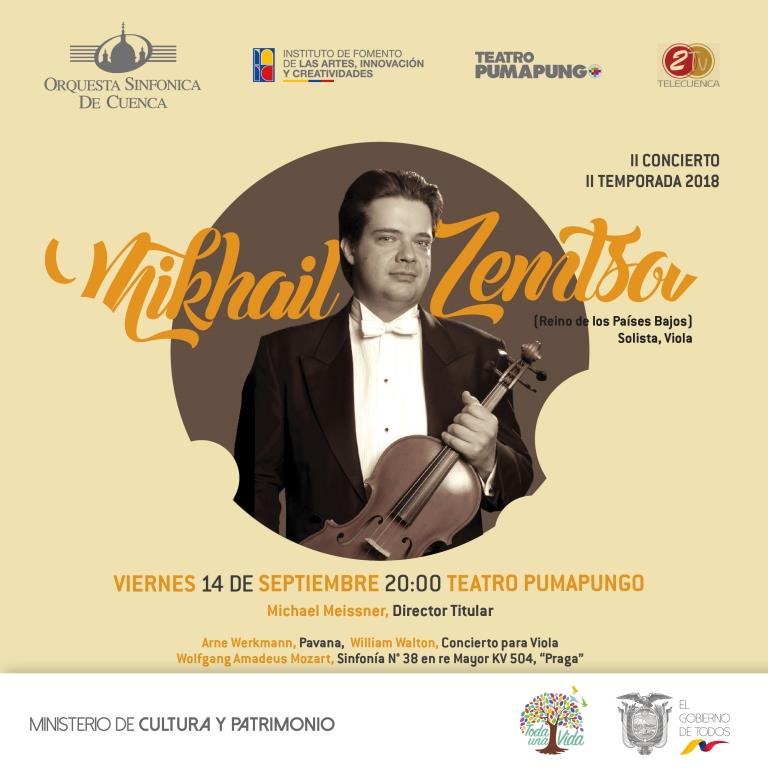 La Orquesta Sinfónica de Cuenca, bajo la batuta del maestro Michael Meissner, Director Titular presenta su segundo concierto de la segunda temporada 2018 con la participación del reconocido violista Mikhail Zemtsov (Reino de los Países Bajos), Solista Invitado, el viernes 14 de septiembre en el teatro Pumapungo a las 20:00, la entrada es LIBRE hasta llenar aforo. Este es el repertorio: