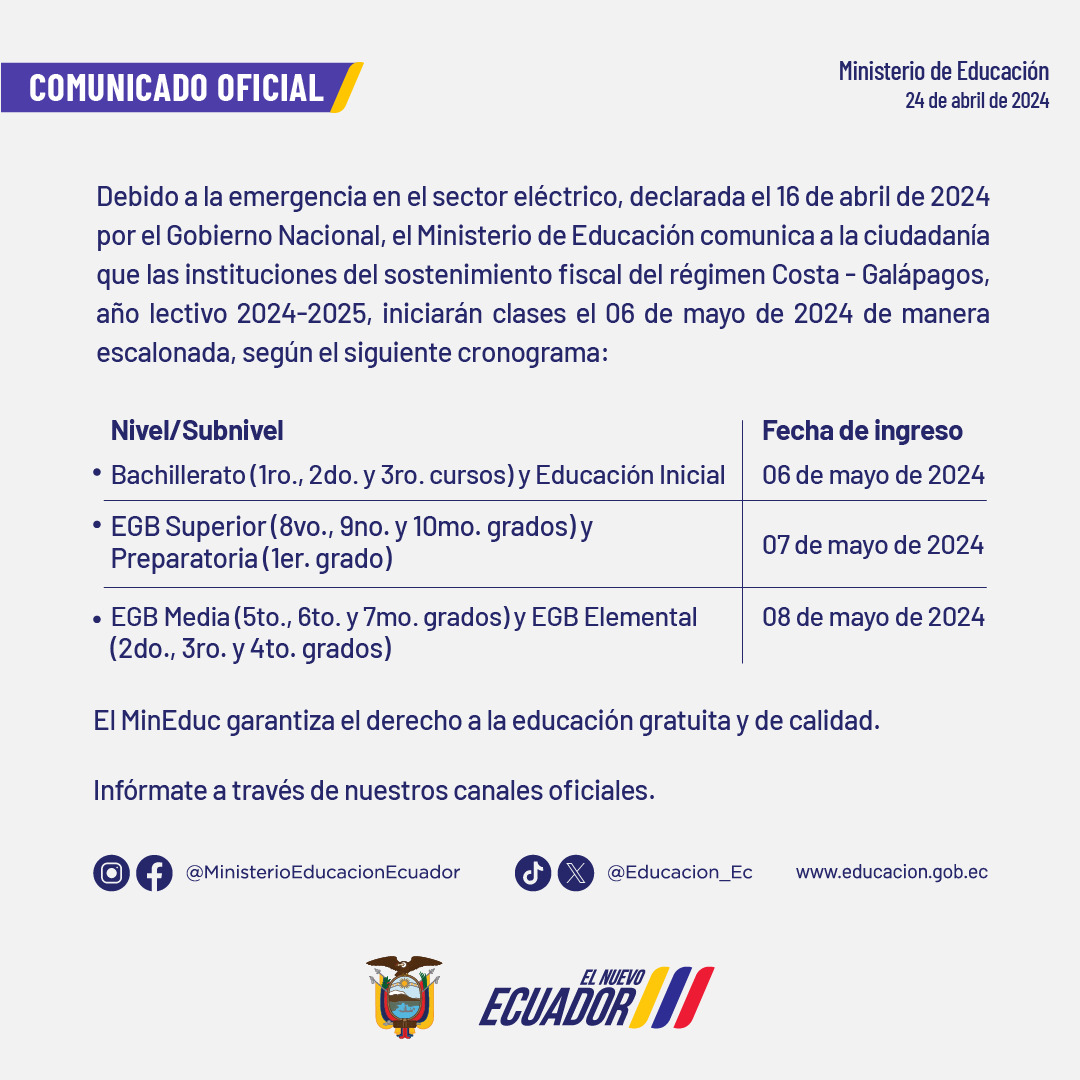 29 abril 2024 Ministerio de Educación comunica a la ciudadanía que las instituciones educativas fiscales del régimen Costa – Galápagos, año lectivo 2024-2025, iniciarán clases el 6 de mayo de 2024, de manera escalonada. |By Administrador Vision|0 Comment|Nacionales | Share Post Gobierno asigna fondos para restablecer 37 nuevas unidades de generación eléctrica COMUNICADO MINISTERIO DE INCLUSIÓN ECONÓMICA Y SOCIAL About Post Author Administrador Vision Leave a Reply Cancel ReplyYou must be logged in to post a comment.