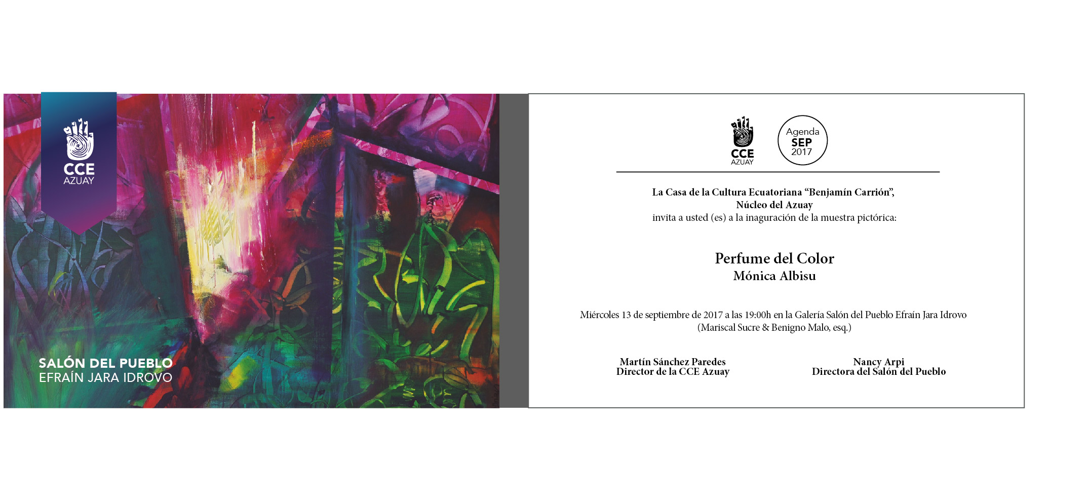 La reconocida pintora argentina Mónica Albisu, inaugurará el día miércoles 13 de septiembre su exposición “El Perfume del Color” en la Galería Salón del Pueblo Efraín Jara Idrovo a las 19h00.