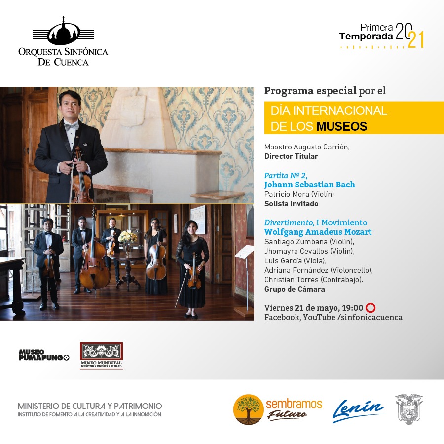 Fueron magníficos escenarios el Museo Municipal de Arte Moderno, Museo del Sombrero, Museo Municipal Remigio Crespo Toral, el Centro Interamericano de Artes y Artesanías Populares CIDAP, el Museo de las Culturas Aborígenes, y el Museo Pumapungo que abrieron generosamente sus puertas a nuestros músicos y en un ambiente lleno de arte, historia, cultura se interpretaron varias obras para ser difundidas por parte del Ministerio de Cultura y Patrimonio el martes 18 de mayo por Ecuador TV y ser replicadas vía online tanto en el canal de YouTube www.youtube.com/sinfonicacuenca como en el Facebook institucional https://www.facebook.com/sinfonicacuenca.