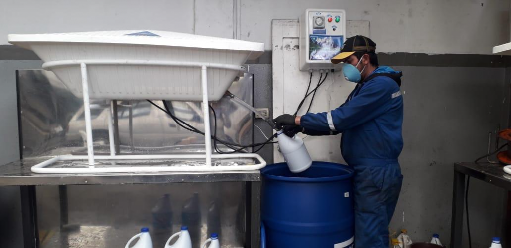 Jhonny Tapia director de talleres de esta institución, indicó que, al momento, este líquido ya se utiliza en la desinfección de las instalaciones de Agrokawsay, de los alimentos que ahí se procesan y los centros de acopio de la Casa de la Provincia y Talleres.