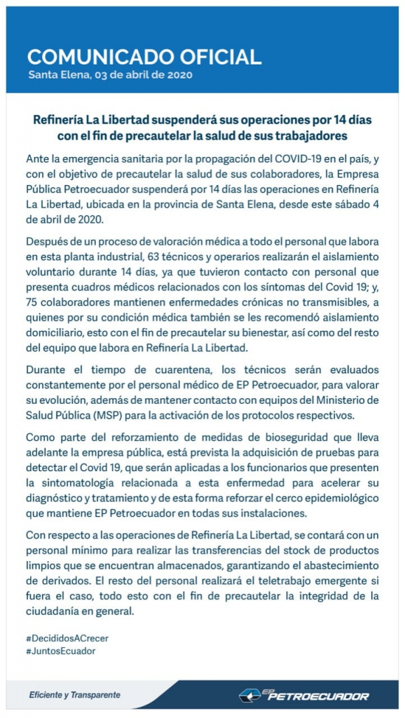 04 abril 2020 REFINERÍA LA LIBERTAD SUSPENDERA SUS OPERACIONES POR 14 DÍAS CON EL FIN DE PRECAUTELAR LA SALUD DE SUS TRABAJADORES |By Administrador Vision|0 Comment|Nacionales DCS – PETROECUADOR |PETROECUADOR Share Post COMUNICADO MINISTERIO DE GOBIERNO Los corredores logísticos cuentan con puntos de desinfección en todo el país para los vehículos de abastecimiento About Post Author Administrador Vision Leave a Reply Cancel ReplyYou must be logged in to post a comment.