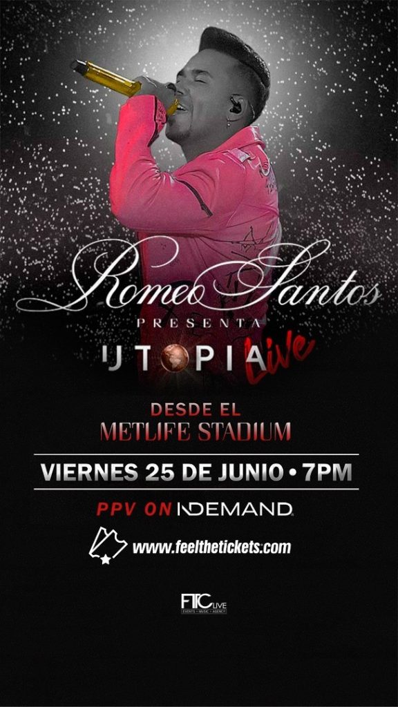 La preventa de Utopía Live del Rey de la Bachata Romeo Santos, inicia desde el lunes 7 de junio y tendrá una duración de 48 horas donde el costo es de $ 15,00 dólares a través de www.feelthetickets.comEsta cita con el rey de la bachata Romeo Santos y sus miles de seguidores, será el viernes 25 de junio del 2021, a partir de las 19h00 Ecuador 20h00 Nueva York. Donde presenta su espectáculo y el documental del concierto “Utopía Live” desde el MetLife Stadium, una noche donde este ritmo se inmortalizo de manera histórica, junto a legendarios bachateros y el encuentro esperado con Aventura, entre los artistas que lo acompañaron están Cardi B, Lenny Santos, Joe Veras, Luis Vargas, Teodoro Reyes, Frank Reyes, Elvis Martínez “el camarón” entre otros. Es sin duda uno de los proyectos más ambiciosos del artista que develó al respecto de este proyecto audiovisual en línea. La transmisión en vivo del concierto Utopía Live tendrá una duración de dos horas, seguida por el documental de 90 minutos. Este espectáculo se podrá ver en cualquier parte del mundo, excluyendo a Crimea, Cuba, Irán, Corea del Norte, Siria. Sobre Romeo Santos, cantautor y actor estadounidense, de origen dominicano, es reconocido como el Rey de la Bachata. Su pasión por la música comenzó desde muy pequeño cuando participaba en el coro de la iglesia local y empezó a componer sus propias canciones. Todos sus recuerdos estaban repletos de cultura latina, con mucho esfuerzo logró acercarse al mundo de la música y cumplir sus objetivos. Siempre fue fanático de la bachata, aun cuando no era un género popular. A la edad de 14 años, Romeo Santos dio sus primeros pasos cuando hizo parte del grupo llamado “Los Tinellers”, formado por su primo y dos amigos, con quienes llegó a sacar un disco llamado Trampa de amor. A finales de los 90 el grupo pasó a llamarse Aventura. Se convirtió en el líder, vocalista y compositor principal de la agrupación logrando con ellos popularizar este ritmo a nivel internacional. Algunas de sus canciones llegaron a los primeros puestos de las listas de los rankings Latinos y de Europa. En el 2011 anuncia su separación de la agrupación para lanzarse como solista, desde entonces Romeo ha logrado siete sencillos No.1 en el Hot Latín Chart y ocho No. 1en el Hot Tropical Songs Chart. Ha lanzado 4 álbumes de estudio, “Fórmula vol. 1” ganador a un premio Grammy como mejor álbum tropical, “Fórmula vol. 2”, “Golden” y “Utopía” Recibido premios Juventud, Premios Lo Nuestro, Premios Soberano y Premios ASCAP. Nominaciones Billboard Music Awards, Latin Music Awards.