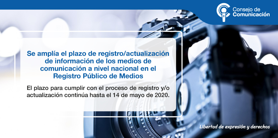En este sentido, informamos a todos los medios de comunicación a nivel nacional, que el plazo para cumplir con el proceso de registro y/o actualización en el Registro Público de Medios continúa hasta el 14 de mayo de 2020.