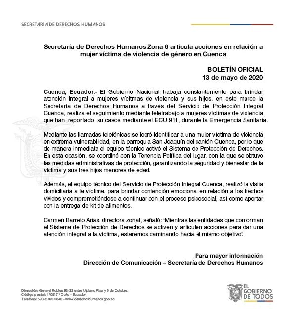 Secretaría de Derechos Humanos Zona 6 articula acciones en relación a mujer víctima de violencia de género en Cuenca