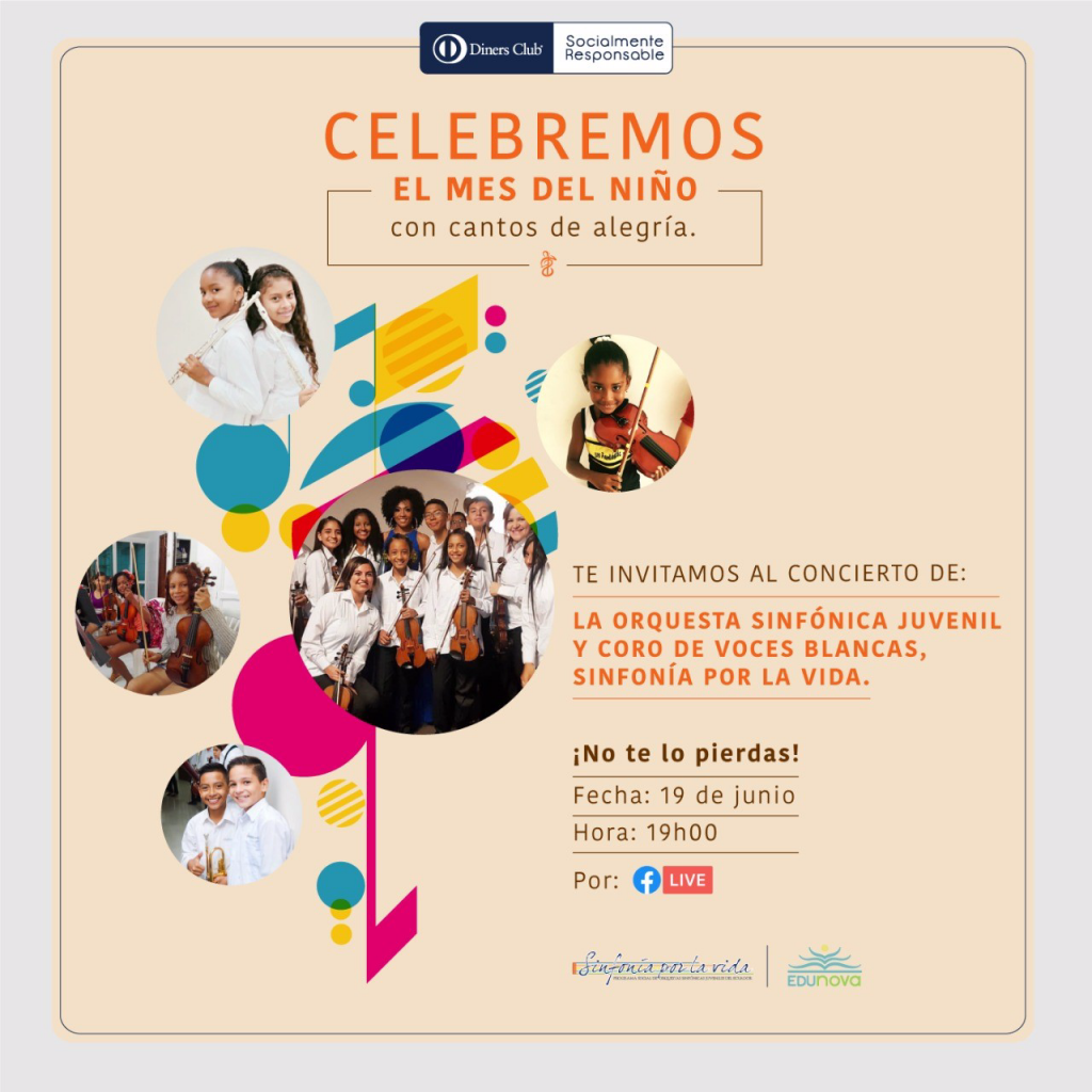 El próximo sábado 19 de junio, Sinfonía por la Vida, junto a la Orquesta Sinfónica Juvenil y Coro de Voces Blancas brindará un concierto transmitido por Facebook Live a partir de las 19h00 con motivo de celebración por el mes del niño. El evento musical se realiza gracias al apoyo de Diners Club y estará bajo la dirección artística y musical del maestro Edison Gualotuña Ruiz.