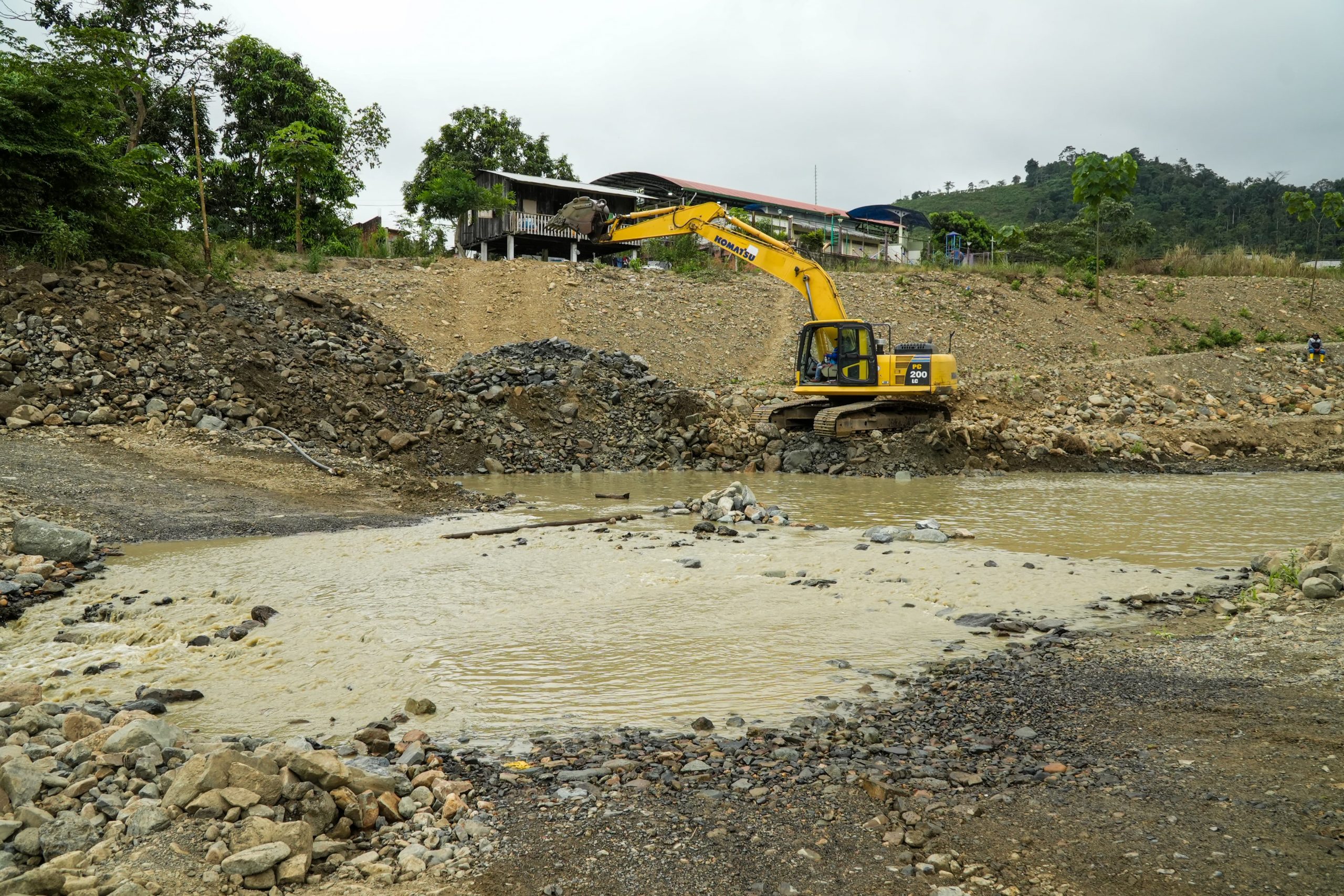 Con la finalidad de prevenir futuros desbordamientos e inundaciones que pueda ocasionar el fenómeno de El Niño, maquinaria de la prefectura de Azuay trabaja en la limpieza de los puntos críticos en las márgenes del río Tixzay en la parroquia Molleturo, cantón Cuenca.